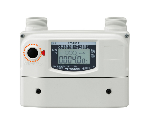 ガスメーター前面左側の遮断弁開スイッチ(黒い部分)を押してください。