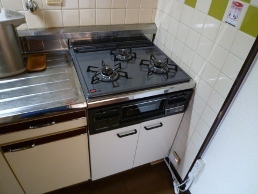長くお使いいただいたコンロはキャビネット式コンロ。取替の機種が少ないこともあり、ビルトイン用の収納庫もご一緒に交換することを提案いたしました。豊富な種類のビルトインコンロからお選びいただくことができました。収納庫とコンロの取替で、約2時間半ほどで終了いたしました。