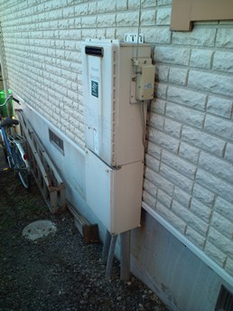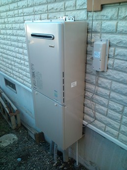 給湯器本体内部から水が漏れているとのことでご訪問しました。修理費用がかなりかかってしまうので、取替のご提案をいたしました。通常、給湯器とリモコンは線で繋がっておりますが、こちらの給湯器は松下製の無線タイプ。無線に対応したリンナイ製のふろ給湯器をオススメし、外壁とマッチしたシャンパンゴールドの本体をお選びいただきました。