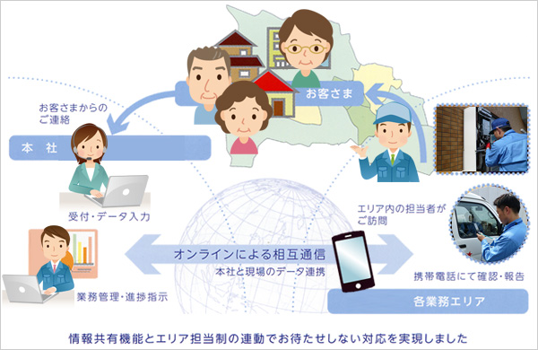 エリアごとに専属の担当者を選任し、エリア担当者は地域やお客さまについて熟知し、よりきめ細かいサービスを提供しております。