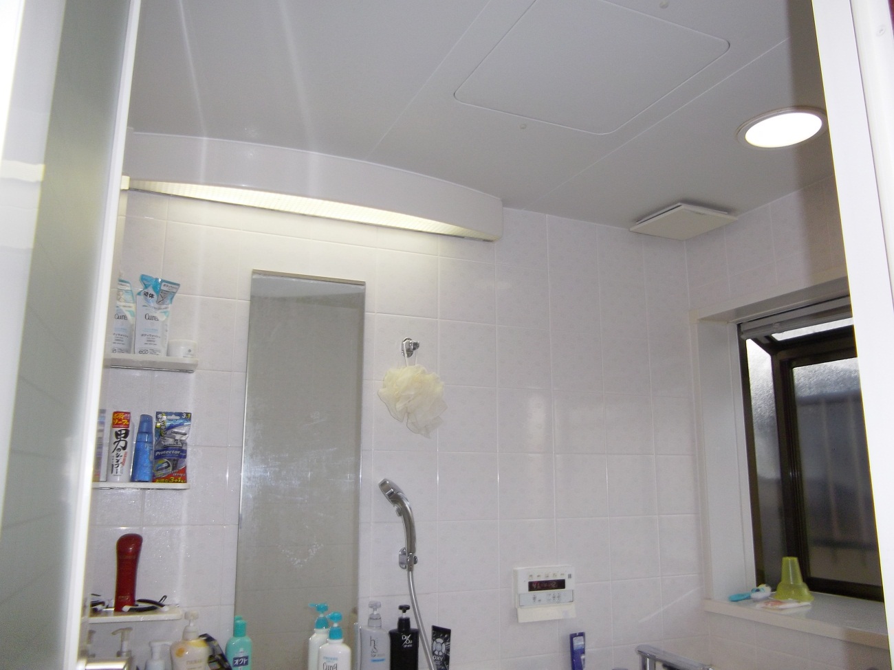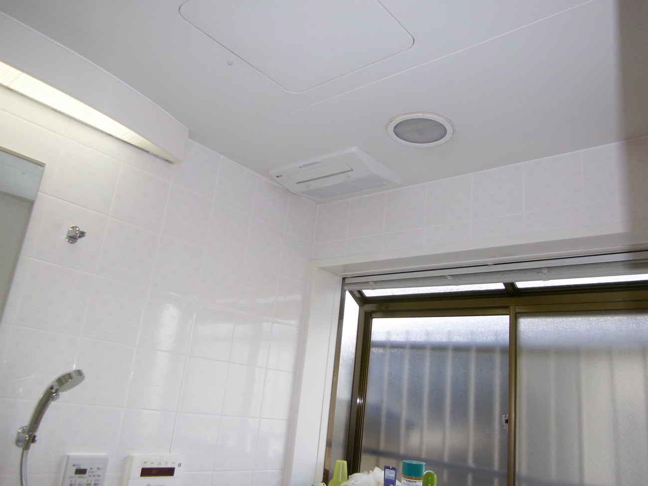 お客様の浴室はすでにユニットバスでしたので天井埋め込み型が設置できるか確認させて頂き、取付が可能でしたのでご提案させて頂きました。浴室内に後付けよりもすっきりして見た目にも今までと変わりなく違和感も感じずにご使用頂けると思います。