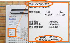 ※給湯器のメーカー名、型番の確認場所は下記の画像を参考にご確認ください。
