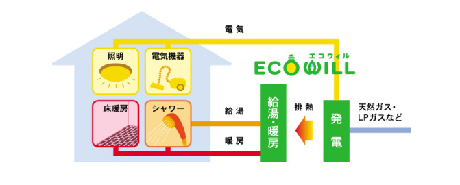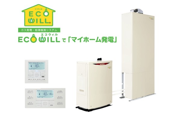 「エコウィル」は、ガスで発電しながらお湯を作る家庭用コージェネレーションシステムです。