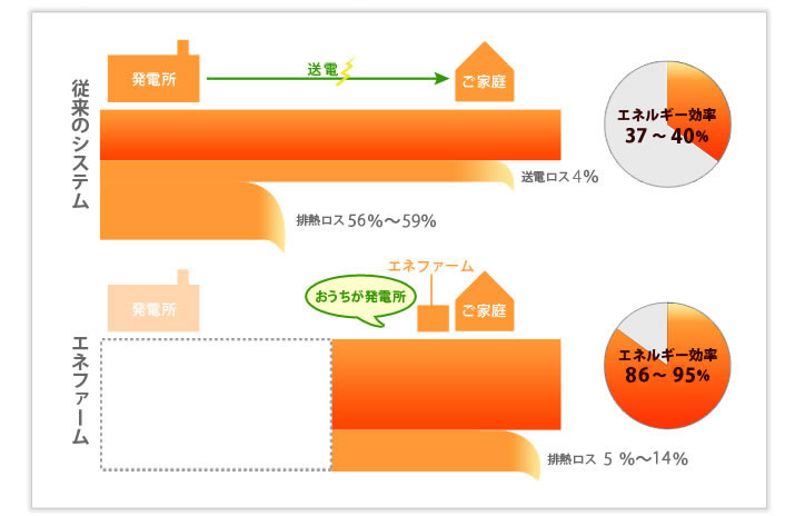 おうちで発電するエネファームは、発電所から送電される際に生じるエネルギーのロスがありません。