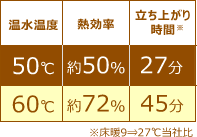 ノーリツの温水式床暖房は、50℃のお湯を使用。一般的な60℃タイプに比べ、効率的に暖めるから、50℃でも同じ暖かさ。経済的で地球にもやさしい暖房なのです。